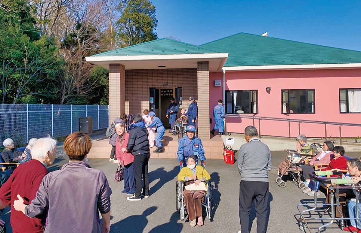 訓練は施設内の職員が1人となる夜間に災害が起こった想定で行われた。発災後に職員が施設利用者を玄関まで誘導し、駆けつけた近隣住民らが介助して「いっとき避難場所」である駐車場まで避難。さらに、水消火器や煙体験、毛布を使った輸送なども実施され、災害時の連携を確認した。