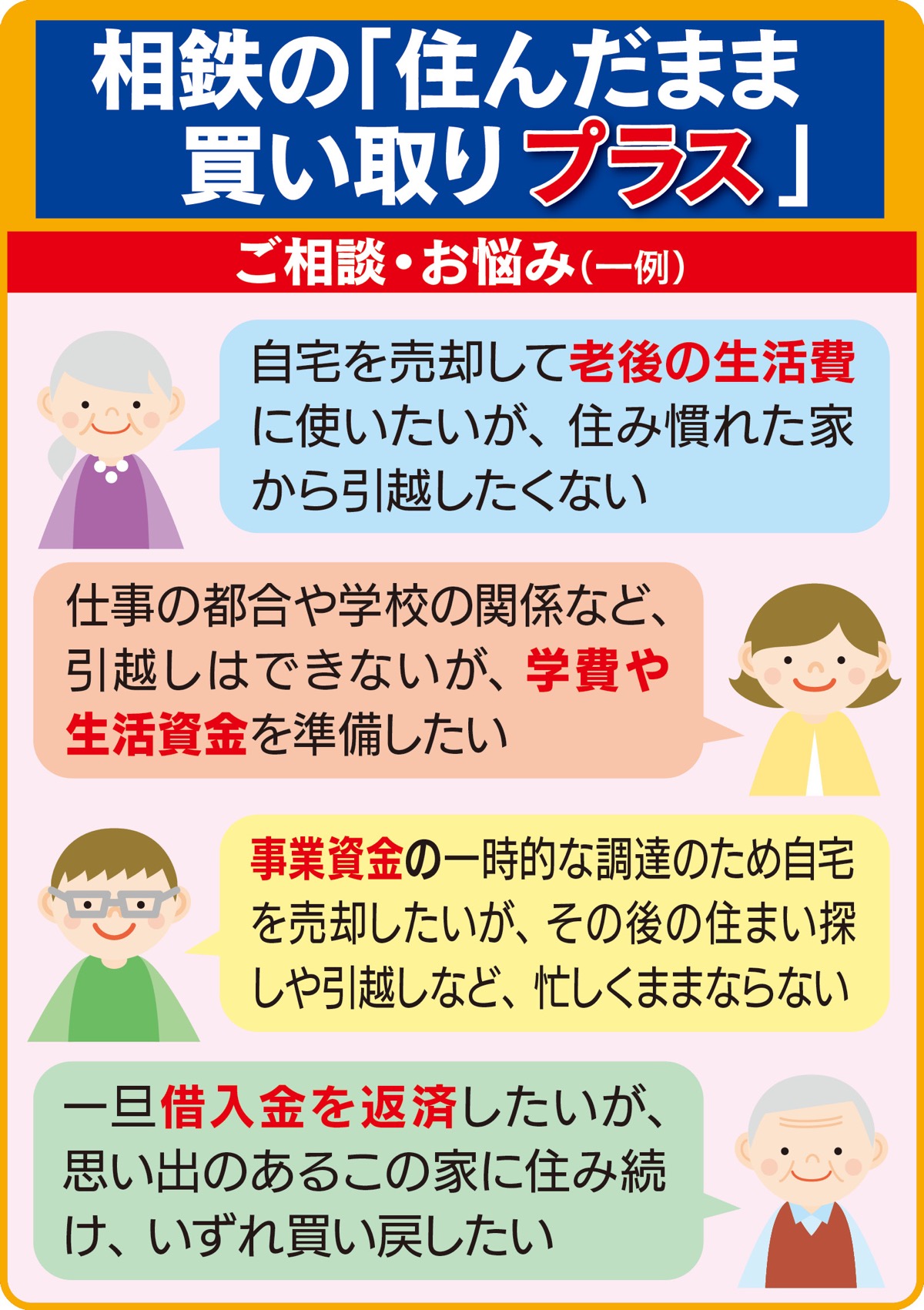 相鉄不動産販売(株)では新サービス「住んだまま買い取りプラス」の問合せが非常に増えているという。このサービスは自宅等を売却することで、まとまった現金が手に入り引越すことなくずっと住み続けられるというもの。毎月の賃料を支払うだけで毎年の固定資産税やマンションの管理費などもなくなりローン(借入)ではないので「審査が厳しい」「追加担保の要求」といった心配もなく将来の計画が立てやすいのもメリット。まずは気軽に問い合わせを。