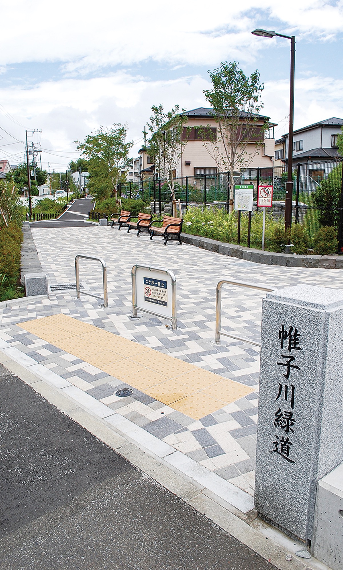 帷子川緑道は、2010年度に新河川に流れが変わった後、廃川処理された、旧河川を活用したもの。全1・1Kmの区間で計画されている。今回整備されたのは「今宿橋跡〜日影橋」の約280m。昨年、完成した「今宿橋〜新今宿橋」区間とは水道道を挟んでつながっている。緑道内にはアジサイ、キンモクセイなど36種の樹木が植えられ、7基のベンチが設置されている。また、雨水が一気に河川へ流れ込まないようにするための機能も備えられている。