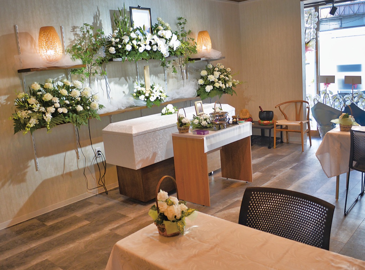 地元葬儀社「ティアーズメモリー」が運営し、明るくきれいな斎場には希望に合わせた祭壇を用意=写真。2階には控室やシャワールームも備え、最後の時間をゆっくりと過ごすことができる。「小規模な葬儀や火葬式のみなど、ご要望にお応えします」と川田卓代表。提携駐車場もあり、見学は随時受付。相談・見積もり無料なので、まずは気軽に問い合わせを。