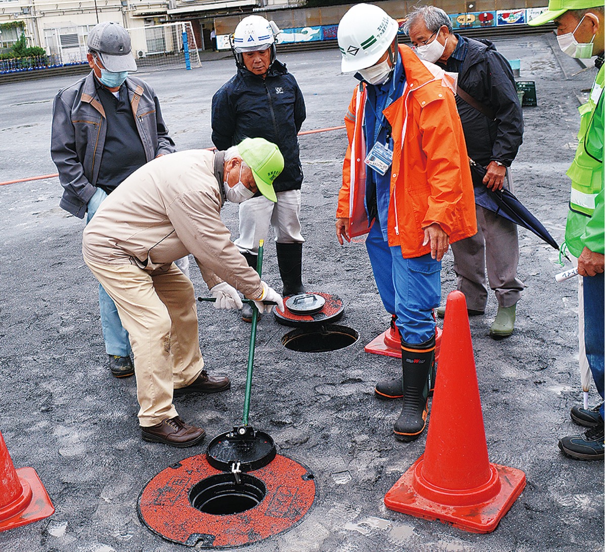 今年7月末から8月にかけて整備された白根小では、10月8日に説明を実施。雨天にも関わらず地域防災拠点を運営する委員らが集まり、体育館で土木事務所職員から仕組みなどの説明を受けた後、プールから送水するポンプの使い方やマンホールの開け方などを実演した。参加した委員らも実際に器具に触れて体験し、いざという時に備えて確認していた。
