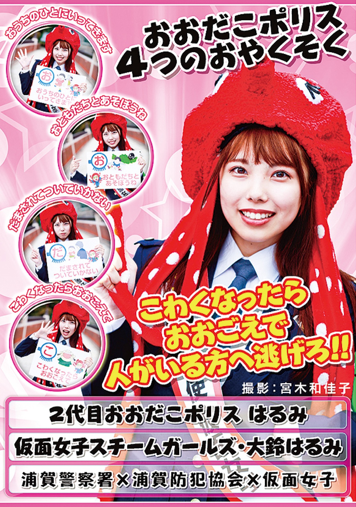 女性アイドルグループ「仮面女子」の大鈴はるみさん=神奈川区在住=が、神奈川県警察が推奨する子どものための防犯標語を呼び掛けるポスターに起用され、現在横浜駅など京急線の駅や小学校などに貼り出されている。