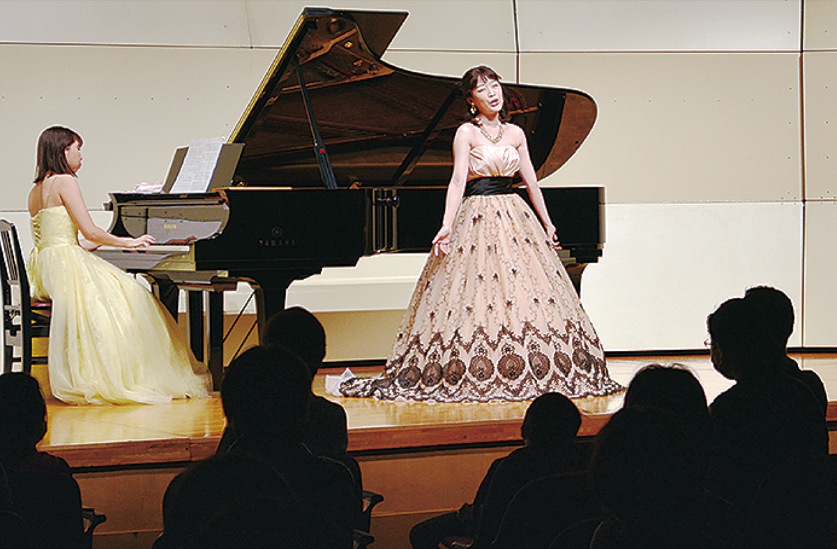 この日は昨年同館が開いたアンサンブル・オーディションで最優秀賞を受賞したデュオのDolcezza(ドルチェッツァ)が登場し、受賞記念コンサートを開催。「歌とピアノが奏でる音色のアソート」と題し、ソプラノとピアノでオペラなどから国内外の楽曲を披露し、会場に歌とピアノの音色を響かせた=写真。