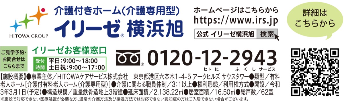全国で100以上の介護施設を運営する「HITOWAケアサービス(株)」が3月1日(月)、介護付きホーム「イリーゼ横浜旭」を横浜市旭区都岡町にオープン予定だ。同ホームは、介護度の高い人も安心して過ごせる要介護専用のホームで、胃ろうやたん吸引などが必要な人も相談ができ、寝たきりや認知症の人も受け入れている。