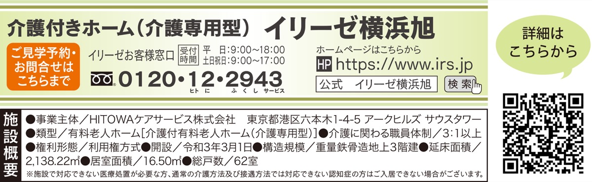 全国で100以上の介護施設を運営する「HITOWAケアサービス(株)」が3月1日(月)、介護付きホーム「イリーゼ横浜旭」を横浜市旭区都岡町にオープンした。同ホームは、介護度の高い人も安心して過ごせる要介護専用のホームで、胃ろうやたん吸引などが必要な人も相談ができ、寝たきりや認知症の人も受け入れている。