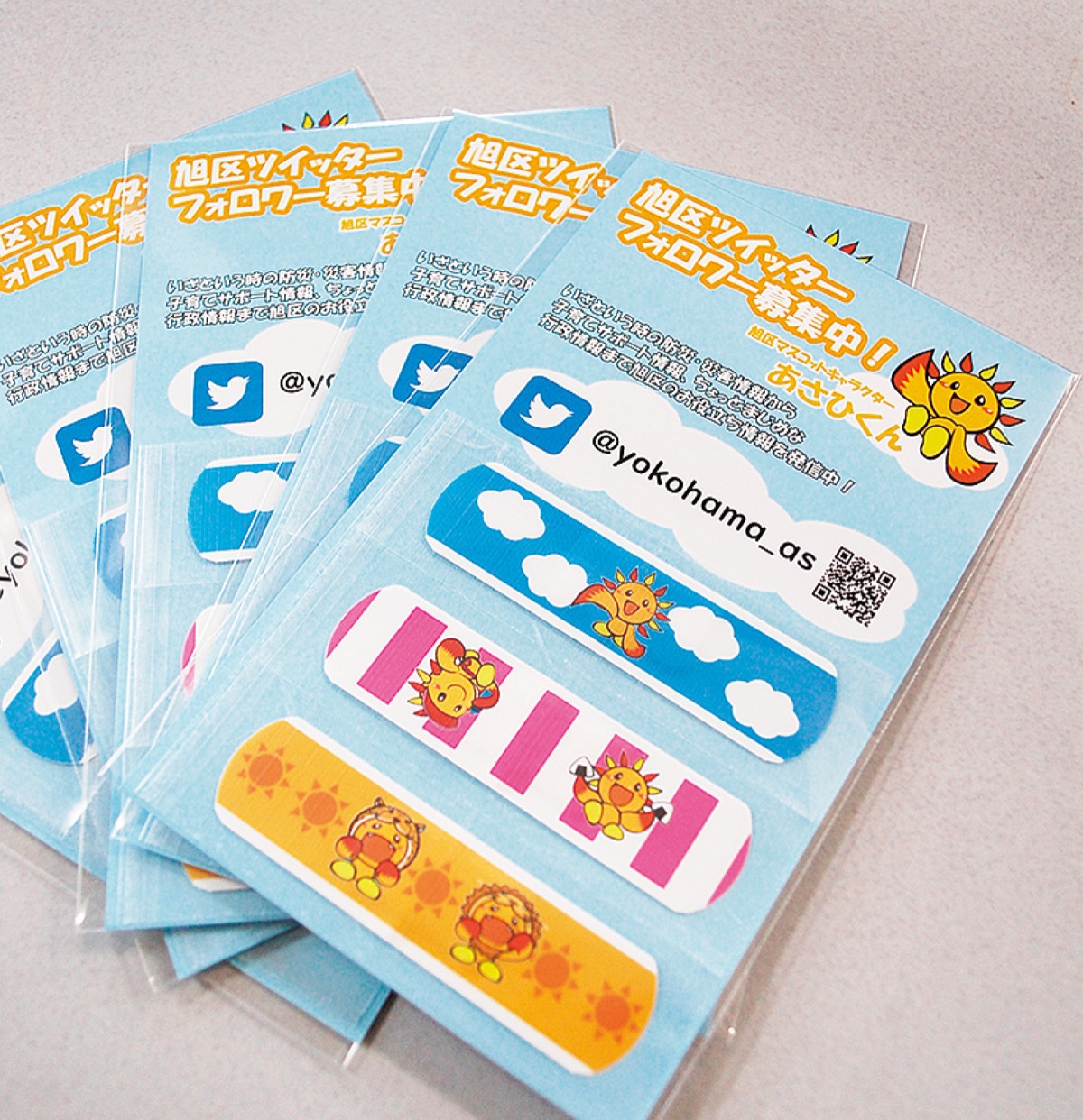 旭区の情報をインターネット発信する「横浜市旭区役所ツイッター」(@yokohama_as)が開設され1年。旭区はさらなる周知とフォロワー数を増やすため、あさひくん絆創膏=写真=を同封した案内を区役所などで配布している。詳細は旭区区政推進課【電話】045・954・6022へ。