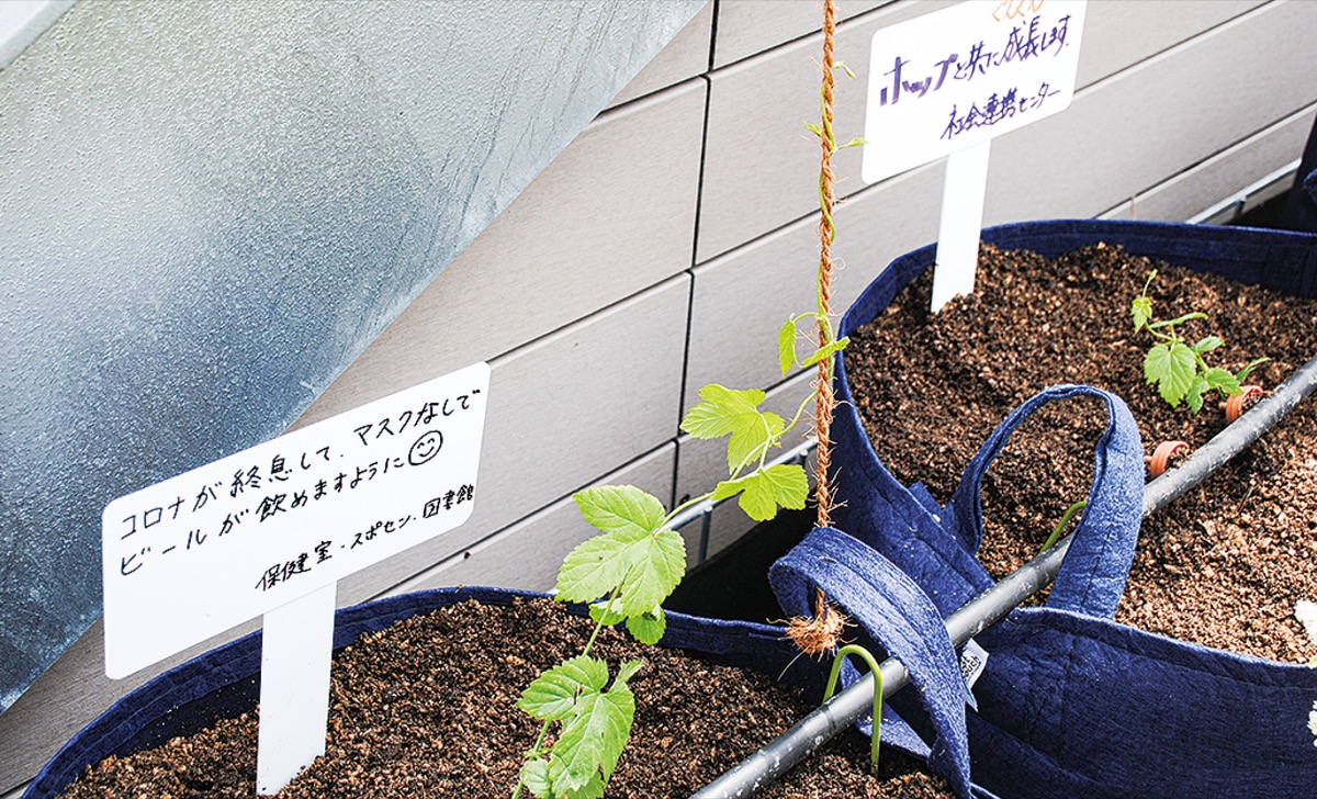 同プロジェクト開始に伴い5月14日、職員ら関係者がホップ苗の植え付け作業を行った。教務や社会連携センターなど同キャンパス内の部署ごとに1つのプランターを担当し、6階テラス階段の両脇に5鉢ずつ配置。今後は雑草取りなど栽培管理を行いながら、(株)Root=南足柄市=が提供するホップ栽培のコミュニティアプリ「THANKS HOP&BEER」と連携し、ホップの生育状況を発信していく。