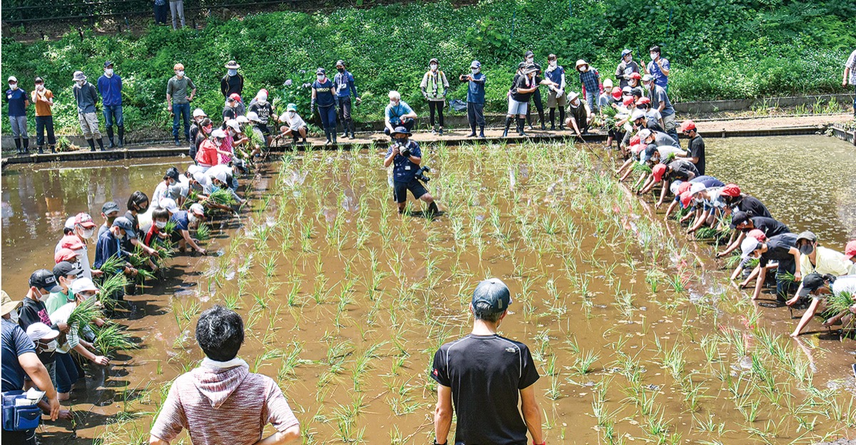 田植えには南本宿小の5、6年生約140人と万騎が原小の4〜6年生約170人が参加。保護者らも見守る中、地下足袋姿で水田に入り、指導員らからアドバイスを受けて下級生が育てた苗を一つひとつ丁寧に植え付けた。