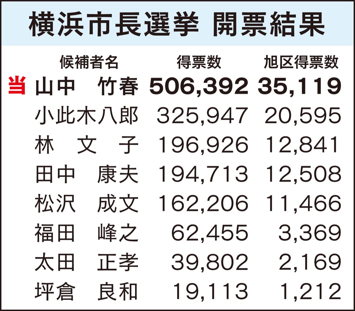 任期満了に伴う横浜市長選挙が8月22日に投開票され、無所属で新人の元横浜市大教授、山中竹春氏(48)=立憲民主党推薦=が約50万票を得て初当選した。過去最多の8人が立候補する中、自民党と公明党が中心に支援した小此木八郎氏(56)や4選を目指した現職の林文子氏(75)らを破り、12年ぶりの市長交代となった。山中氏は争点の一つだった統合型リゾート(IR)誘致に反対しており、市の方針が転換される。投票率は49・05%で前回を11・84ポイント上回った。