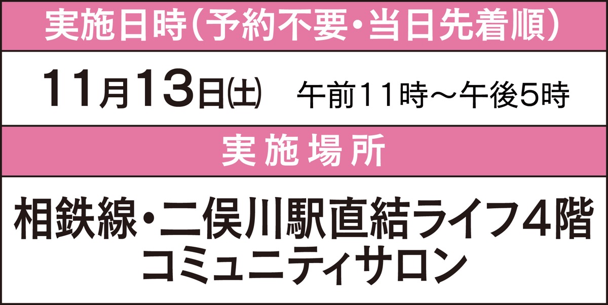 当日先着順、最大40人まで受付。1人30分間の個別相談で、飛沫防止パネルを設けて感染対策を徹底する。詳細は田近淳司法書士事務所【電話】045・361・4270。