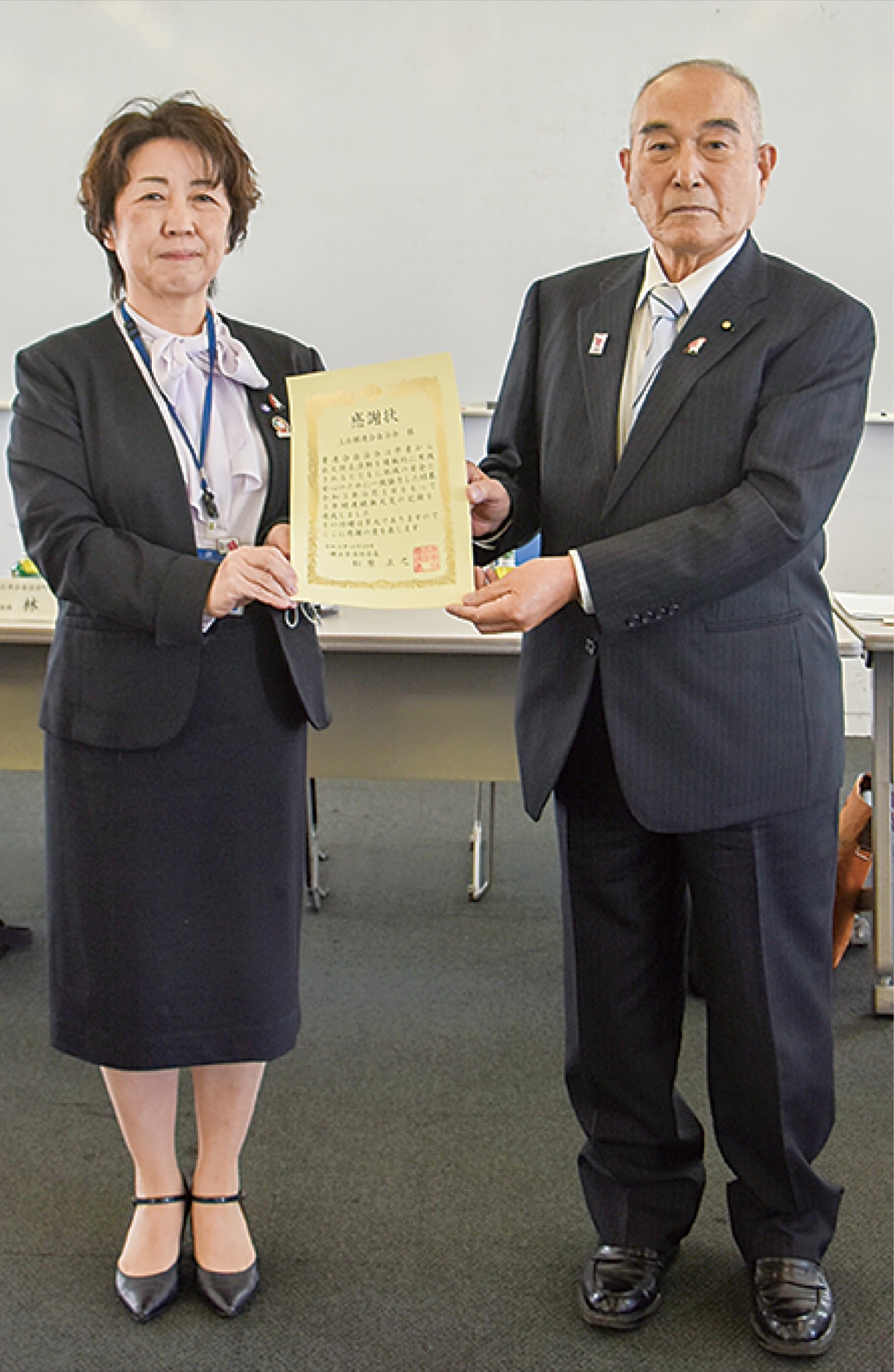 10月18日に行われた「旭区連合自治会町内会連絡協議会10月定例会」冒頭で権藤由紀子区長が中野会長に感謝状を贈呈。「日頃の声掛けや見守りの成果だと思う。これからも協力しながら安全・安心なまちづくりを進めたい」と話した。