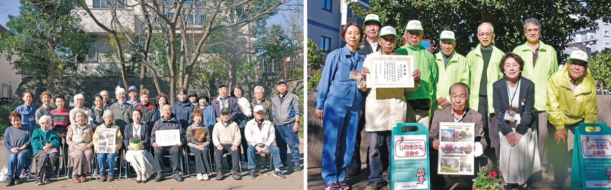 市内の公園で清掃や草花の手入れなどを行う地域ボランティア団体「公園愛護会」の活動に対し、功績が顕著な個人や団体を表彰する「横浜市公園愛護会表彰」。旭区内では同会長を10年間務めた、鎧の渡し緑道公園愛護会および帷子川親水緑道鶴ヶ峰地区公園愛護会の前田正幸会長と、さちが丘蔵屋敷公園愛護会の毛利靖洋会長の2人に表彰状と鉢植えなどの記念品が贈られた。