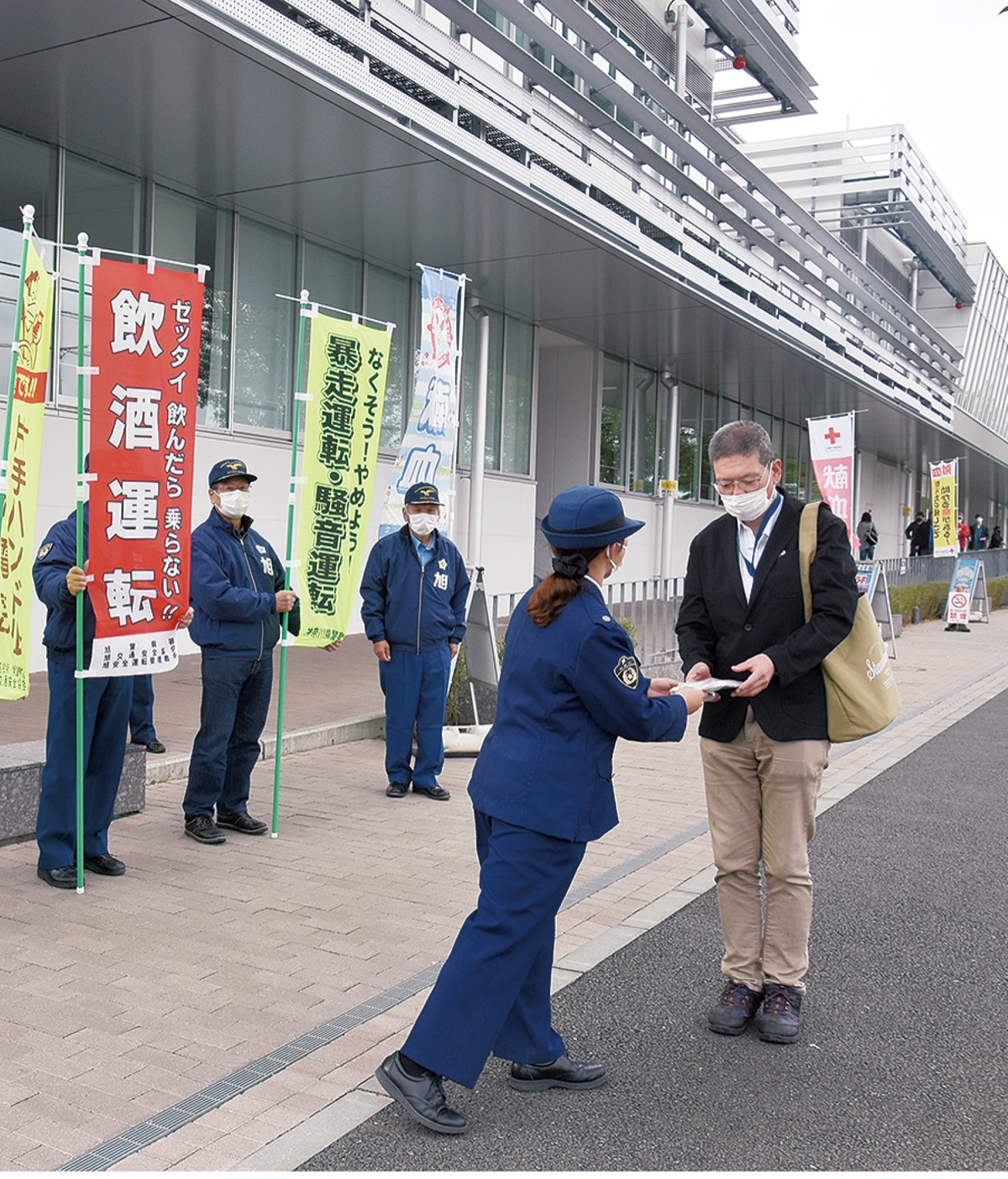 中尾にある神奈川県警運転免許センター前で11月2日、安全運転相談ダイヤル「#8080」の啓発キャンペーンが行われた。旭警察署と旭交通安全協会、神奈川トヨタ自動車(株)が共催したもので、同センターを訪れた人たちにチラシなどを手渡して周知した。