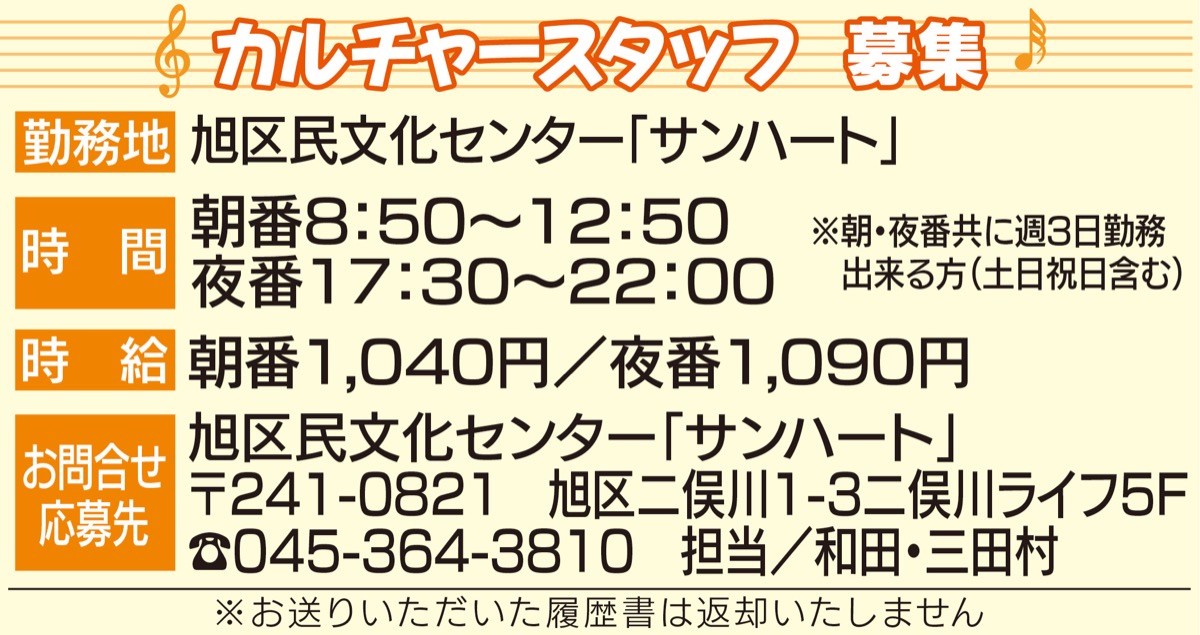 旭区民文化センター「サンハート」(二俣川ライフ5階)は、窓口業務などを担うカルチャースタッフを募集している。