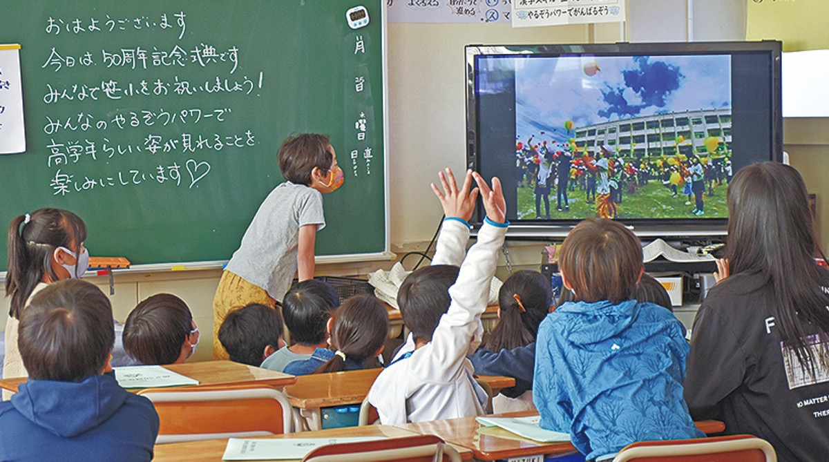 来賓らの挨拶後は、集会委員会が小学校の歴史にちなんだ○×クイズを行ったほか、50周年記念ソングが流れ4年3組の手掛けた振り付けが披露される場面もあった。