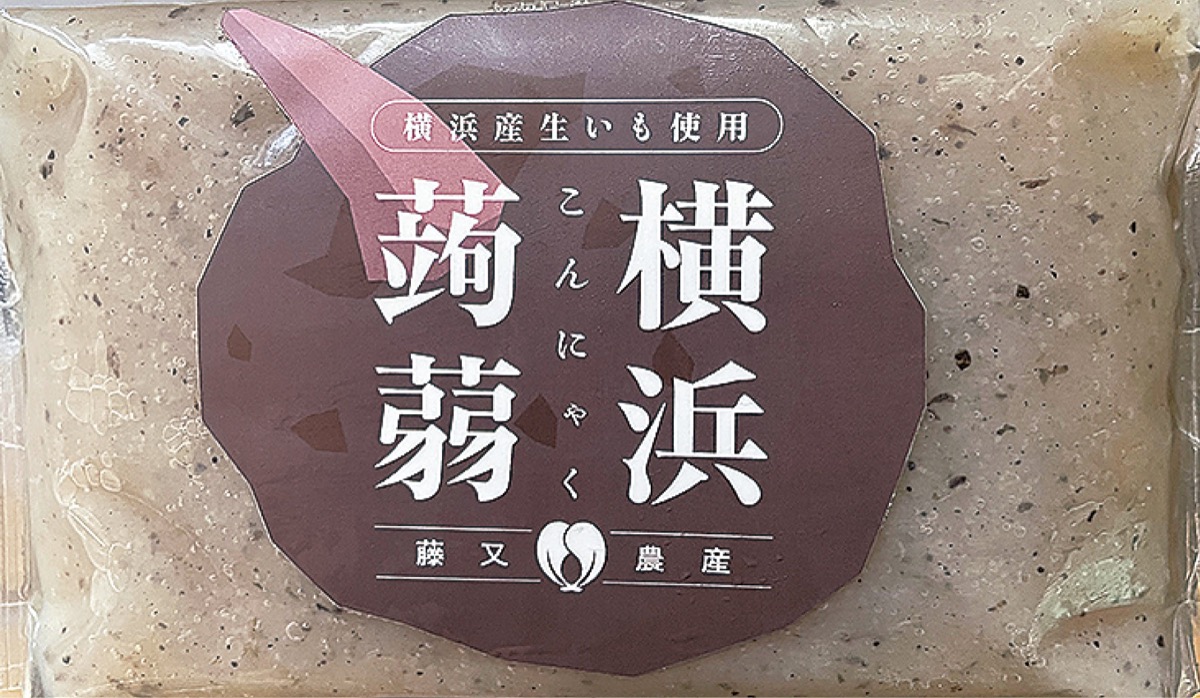 藤又さんは昨年から蒟(こん)蒻(にゃく)芋を栽培し、年末に初収穫。それを群馬県の工場で加工し、JA横浜直売所ハマッ子などに卸している。藤又さんは「生芋をすりつぶしてるので柔らかく、味が染みやすい」と話す。1丁248円(税込)。