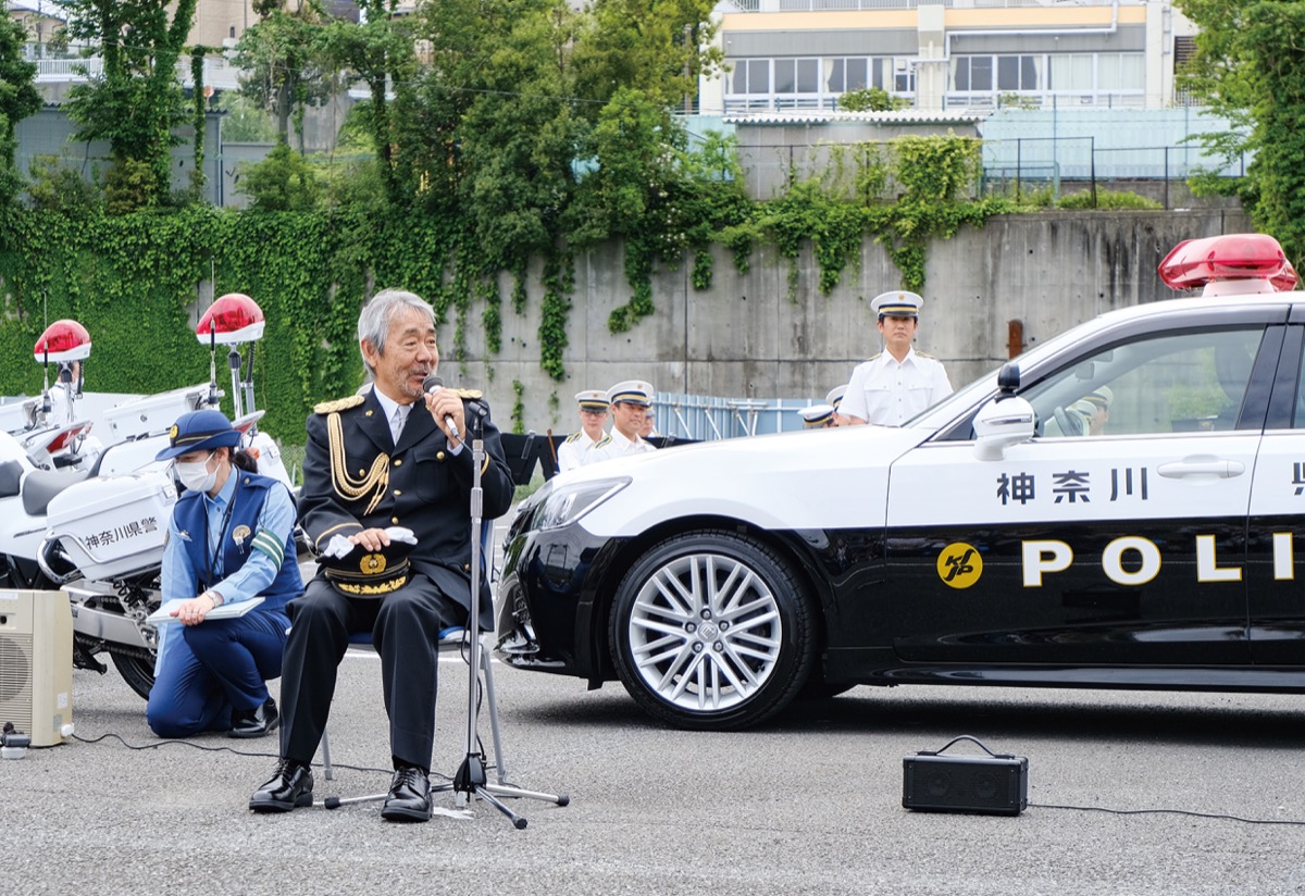 当日は、75歳以上の高齢運転者の他、近隣の学校の生徒がグラウンドなどから見物。大勢の拍手の中、パトカーで登場した寺尾さん。トークショーで「『信号が変わりそうだぞ』『了解』と一人でかけあえば、眠気も冷めます」と安全運転の秘訣などを語った。