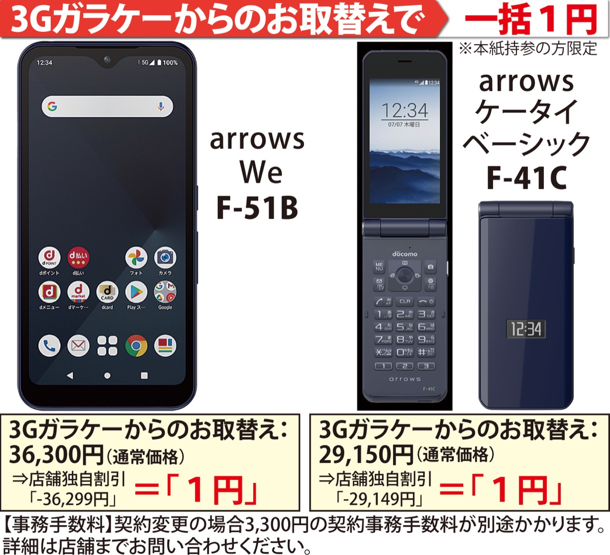 両店ではTN(タウンニュース)を持参してガラケーから機種変更をすると、人気のスマホ「arrows We F―51B」や待望の折り畳みケータイ「arrows ケータイベーシック F―41C」が”1円”で購入できる。この機会に機種変更を検討してみては。もちろん、購入後のフォローも万全なので安心。「スマホ教室は、すぐに予約がうまってしまう人気の企画です。また、スマホ購入後のサポートも行っています。お気軽にお電話ください」と両店スタッフは話す。