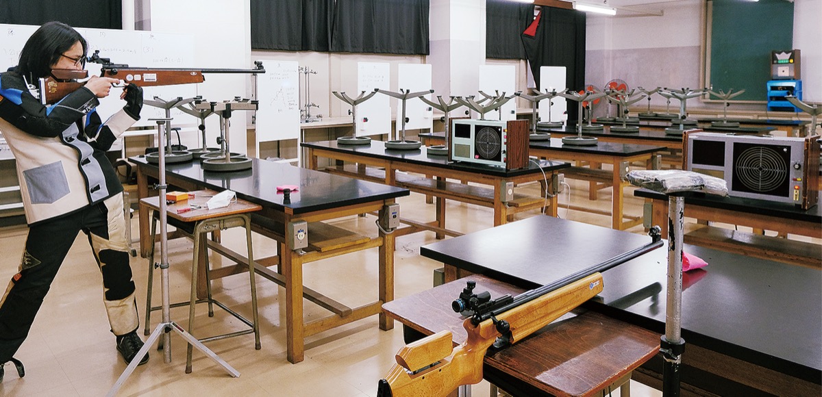 放課後の理科室に鳴り響く電子音──。旭高校では県内でも数少ないライフル射撃部が日々、練習に励んでいる。