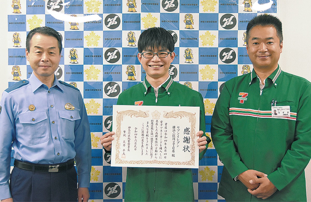 旭警察署(荒井卓夫署長)は6月9日、セブンイレブン横浜二俣川2丁目店が架空請求詐欺を防いだとして、同署で感謝状を贈呈した。