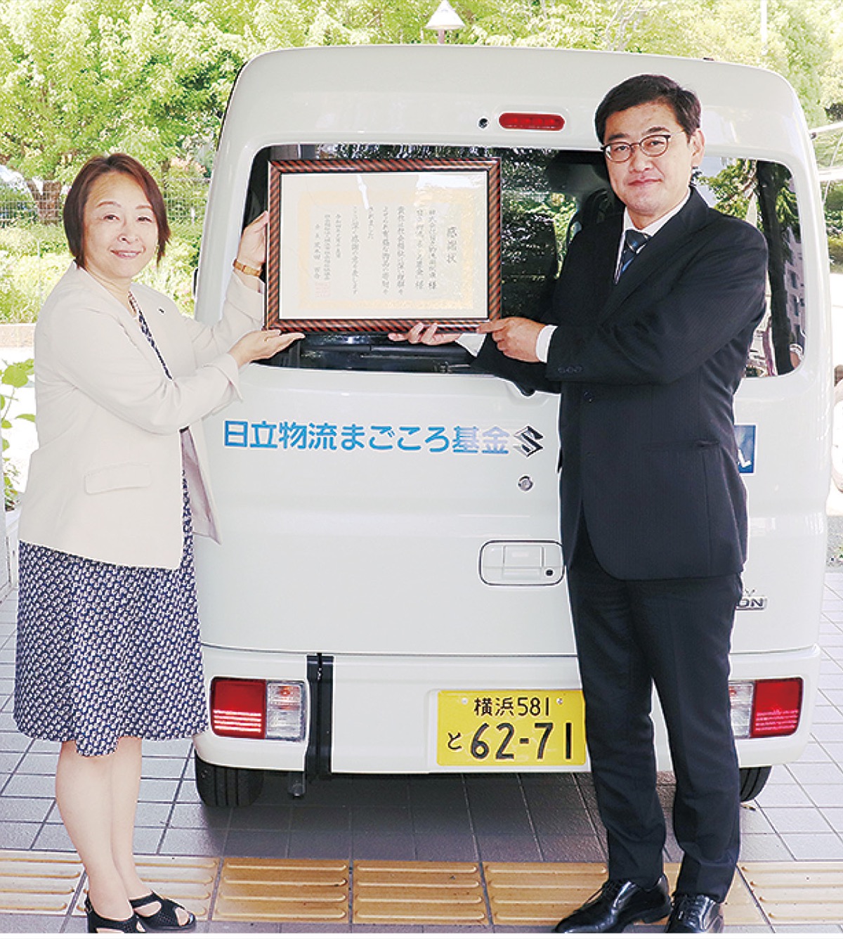 (株)日立物流南関東がこのほど、若葉台地域ケアプラザに車いす移動車を寄贈。5月に同ケアプラザで感謝状の贈呈式が行われ、同社の後関孝志取締役と池田智恵子所長、横浜市社会福祉協議会の関係者らが出席した。