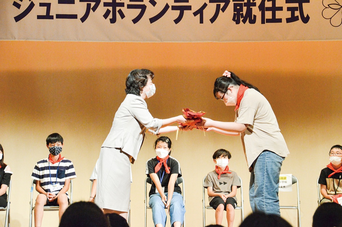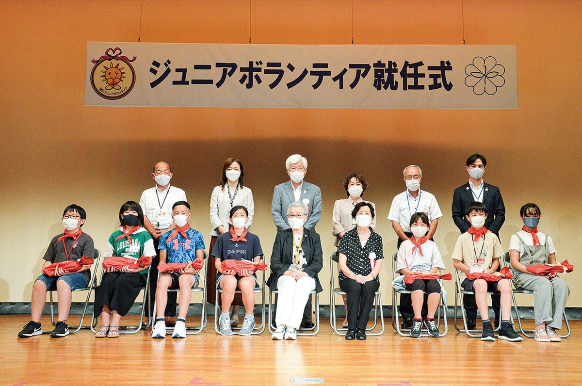 旭区内の小学5・6年生の児童が、自分たちの住んでいる街でさまざまなボランティア活動や地域活動を行う「ジュニアボランティア体験事業」。旭公会堂で8月1日、事業を体験する児童の就任式が行われた。