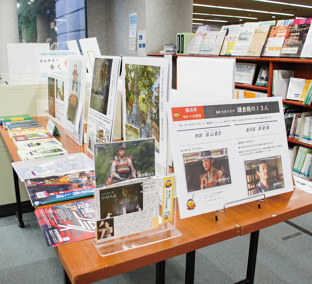 ドラマに合わせて重忠コーナー=写真=を設置している旭図書館=白根4の6の2=では、重忠の最期に合わせ9月30日(金)までコーナーを拡張。「ゆかりの地歩き」をテーマに、関連書籍やパネルの展示が行われている。「ドラマで重忠に興味を持った人たちに、もっと知ってもらう機会になれば」と同館司書の平林朋子さんは話す。