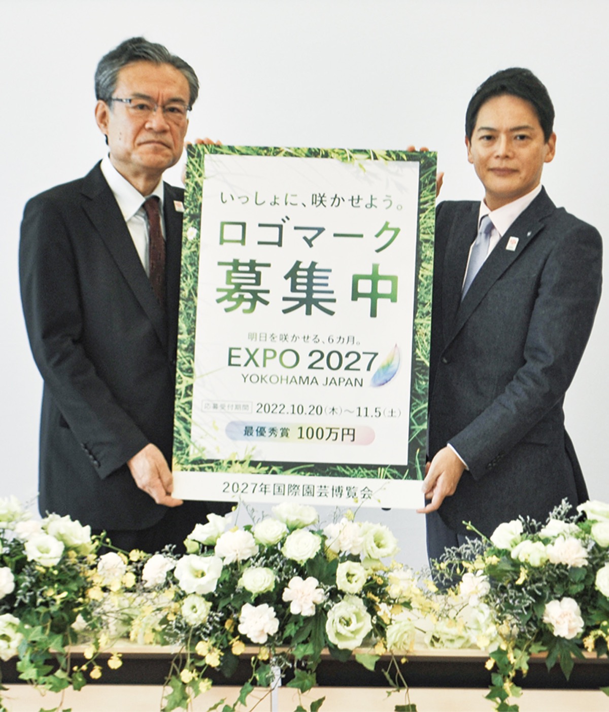 公式ロゴマークの公募について9月21日、同協会の河村正人事務総長と山中竹春市長が記者会見を横浜市役所で行い、公募概要などを紹介した。河村事務総長は「博覧会の目指すテーマへの理解や共感を深め、世界中で期待感を高めるもの」とロゴマークの役割を説明。山中市長は「横浜や日本らしさを世界に発信できるロゴマークが生まれることを期待しています」と話していた。