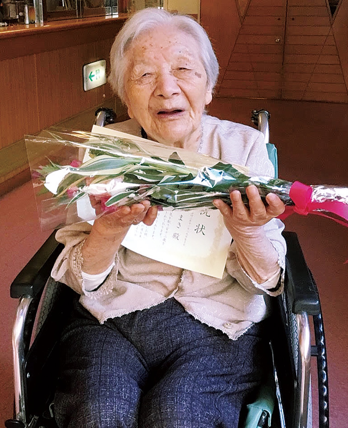 女性の最高齢者となったのが、1909年(明治42年)11月生まれの松本まささん(112歳)。昨年に続き2度目の最高齢者に認定された。