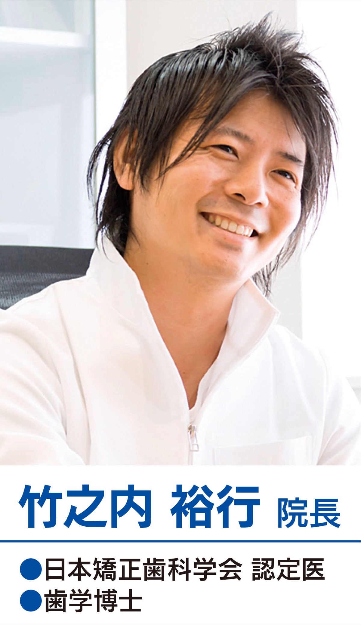 低年齢なほど治療はスムーズだが、「大人になってからでも遅くありません」と竹之内院長。「永久歯が生え始めた頃の小児矯正はあごの骨の成長を利用しながら治療でき、永久歯が生え揃ってからも年齢が低いほど歯が動きやすく治療しやすい。大人ももちろん、歯並びを改善することは十分にできるので諦めないでください」と話す。