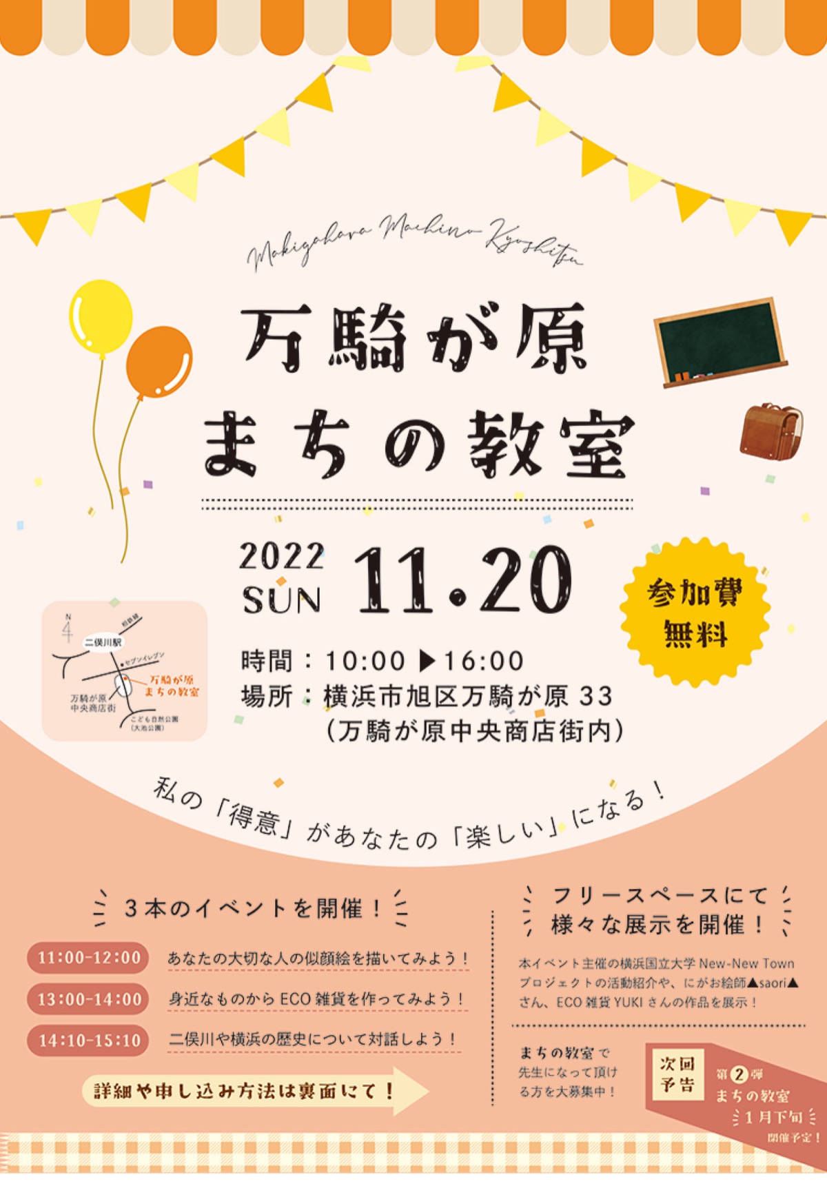 二俣川駅南口の坂の上にある万騎が原中央商店街を会場に11月20日(日)、地域イベント「万騎が原まちの教室」が開催される。開催時間は10時から16時まで。