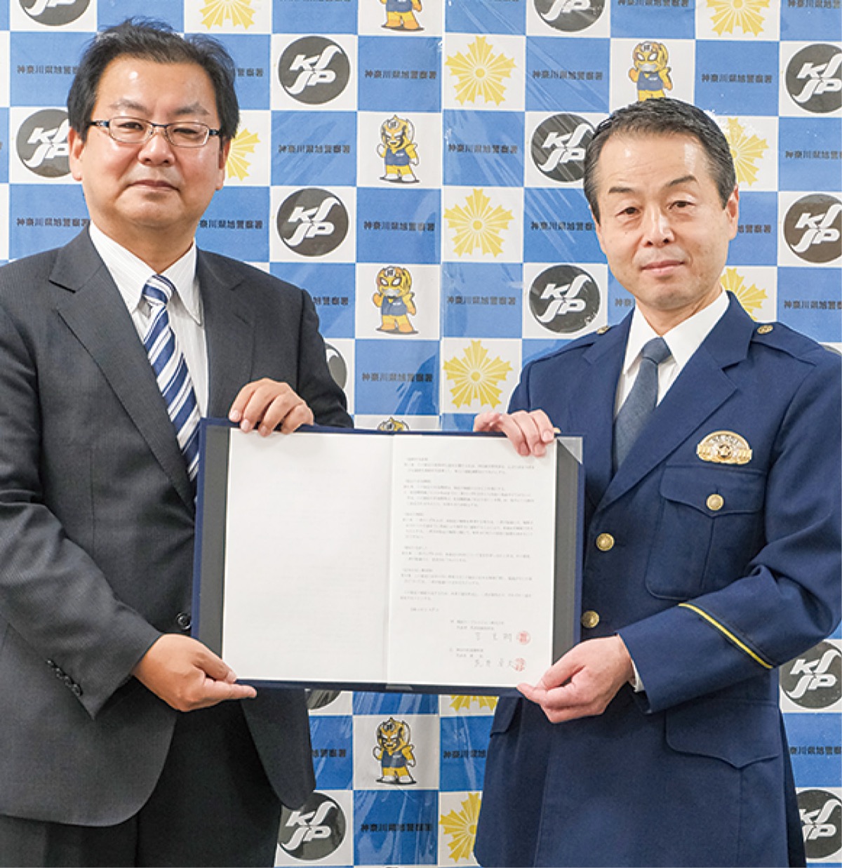 協定式では同社の京克樹社長と荒井卓夫旭警察署長が参加。京社長は「1982年に旭区で開始し、地域に育てられてきた。恩返ししていきたい」と話し、荒井署長は「これまでも協力してもらってきたが、安全で住みやすい旭区のため、さらに強化していけたら」と語った。