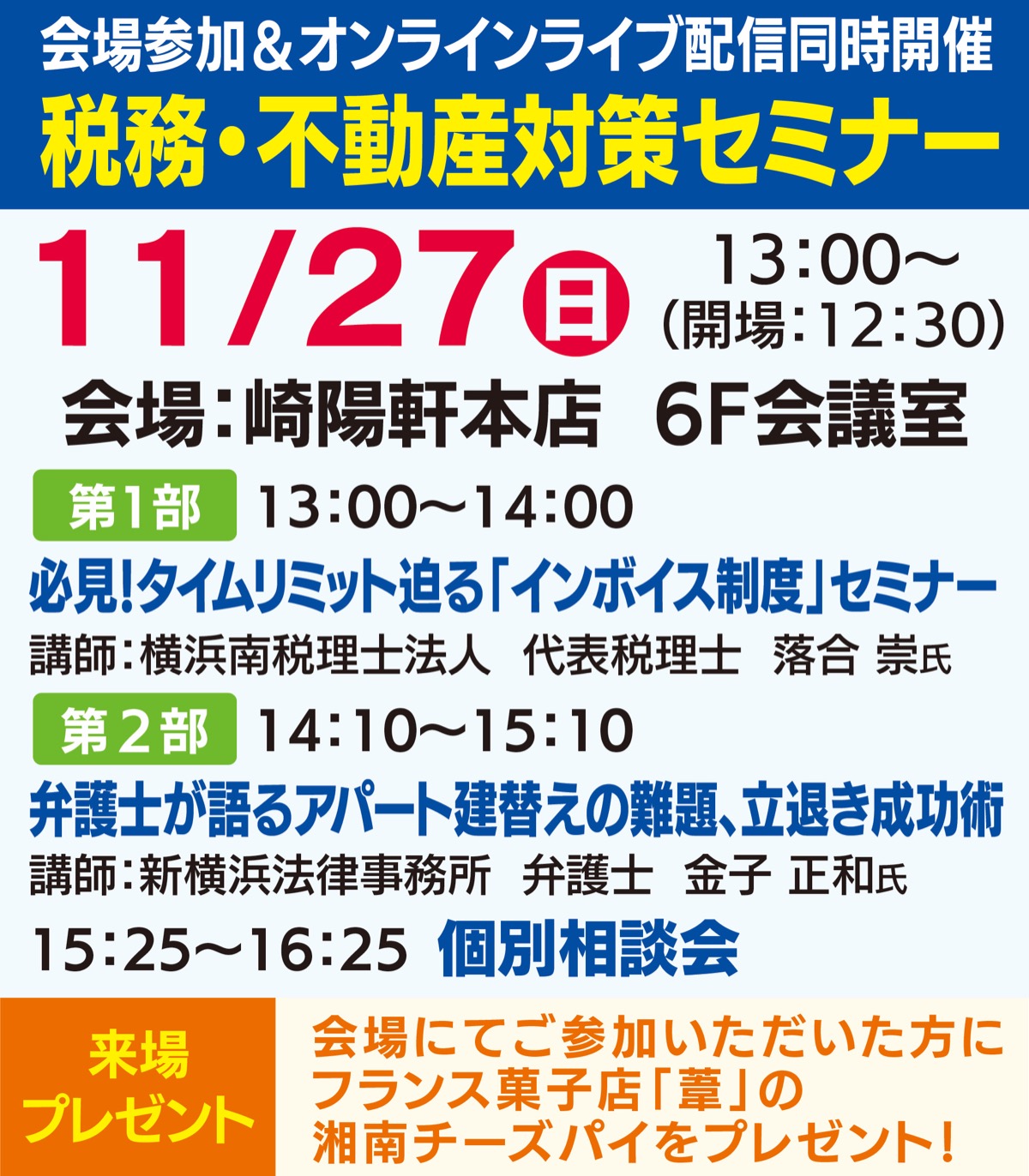 第1部ではタイムリミットが迫るインボイス制度について、店舗や駐車場賃貸等を行う免税事業者に向けて経営への影響や、事前準備などを税理士が解説。第2部はアパート建替え時の立退きをテーマに弁護士が立退き時の注意点、問題点を講演、円満な入居者立退きの交渉術を説明する。