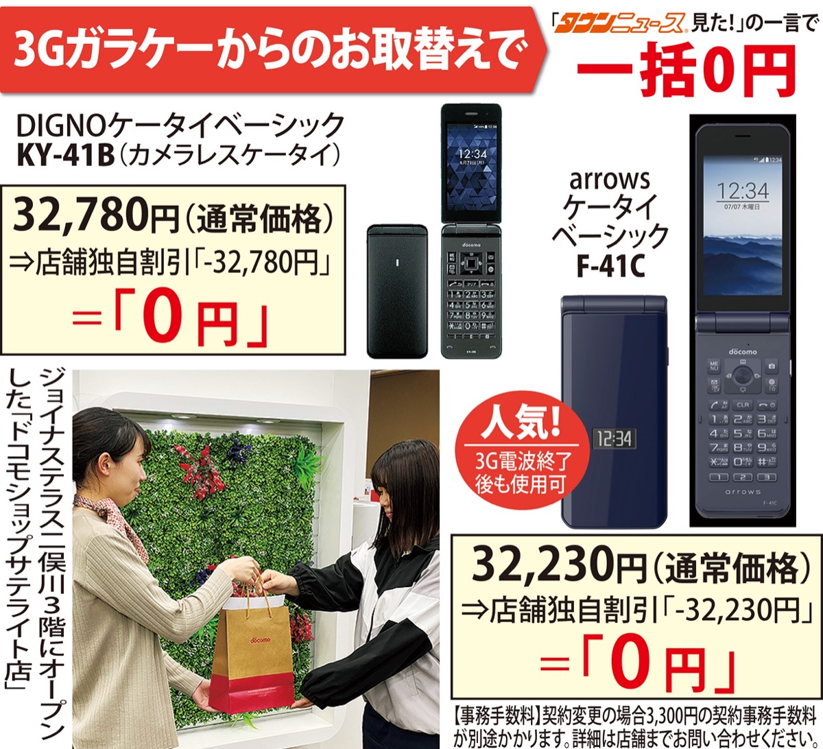 下記『ドコモショップ』店舗では、FOMA専用の相談窓口が設置されている。また、ガラケーから機種変更時に「タウンニュースを見た」の一言で、3G電波終了後も使える折り畳み携帯=写真=が”0円”になるキャンペーンを実施している。「3G電波終了後も使える人気の『折り畳み携帯』です。販売が終わってしまう前のこの機会にぜひご検討を。そのほかの携帯電話に関するご相談もお気軽に」と店舗スタッフ。スマホ教室の毎日開催などサポートも充実している。
