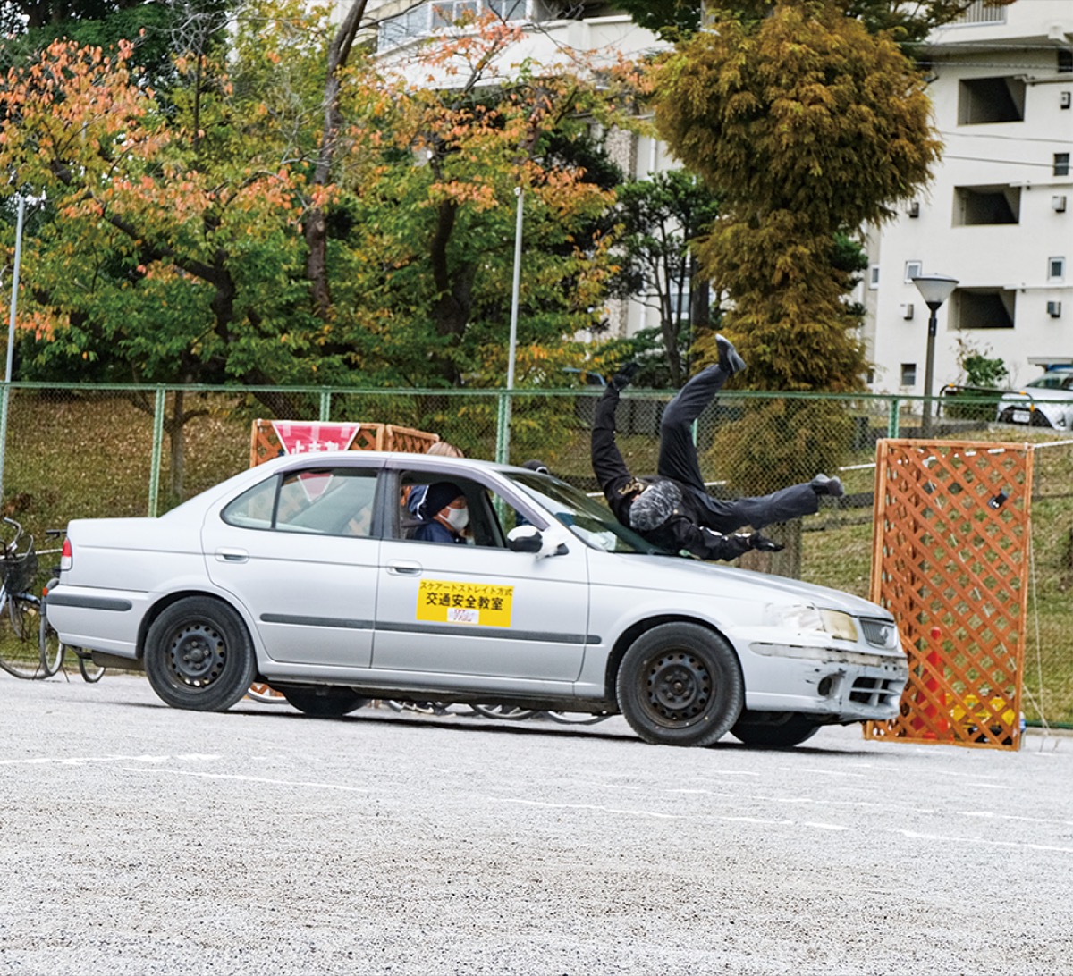 スタントマンによる交通事故の再現を見て交通ルールやマナーを再確認する交通安全教室が11月1日、左近山プレイグランドで行われた=写真。対象者は地域の高齢者で、旭区主催。