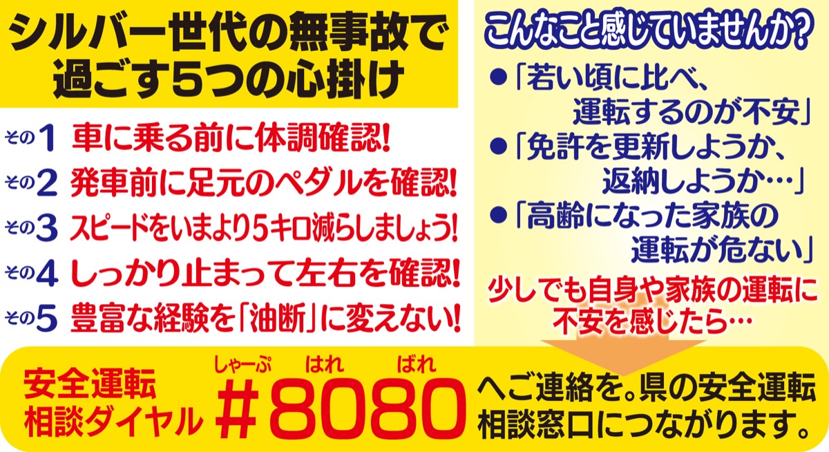 発生した事故で特に多かったのは昨年に引き続き「二輪車の事故」と「高齢者の事故」。二輪車の事故は「右折車と直進するオートバイの『右直事故などが特に多く、高齢者は道を横断する際の事故が多いという。同課職員は「横断歩道を渡っていても事故に遭う人がいる。もちろん車が悪いが、ご自身の身を守るためにもしっかり確認の上で渡りましょう」と注意を促す。