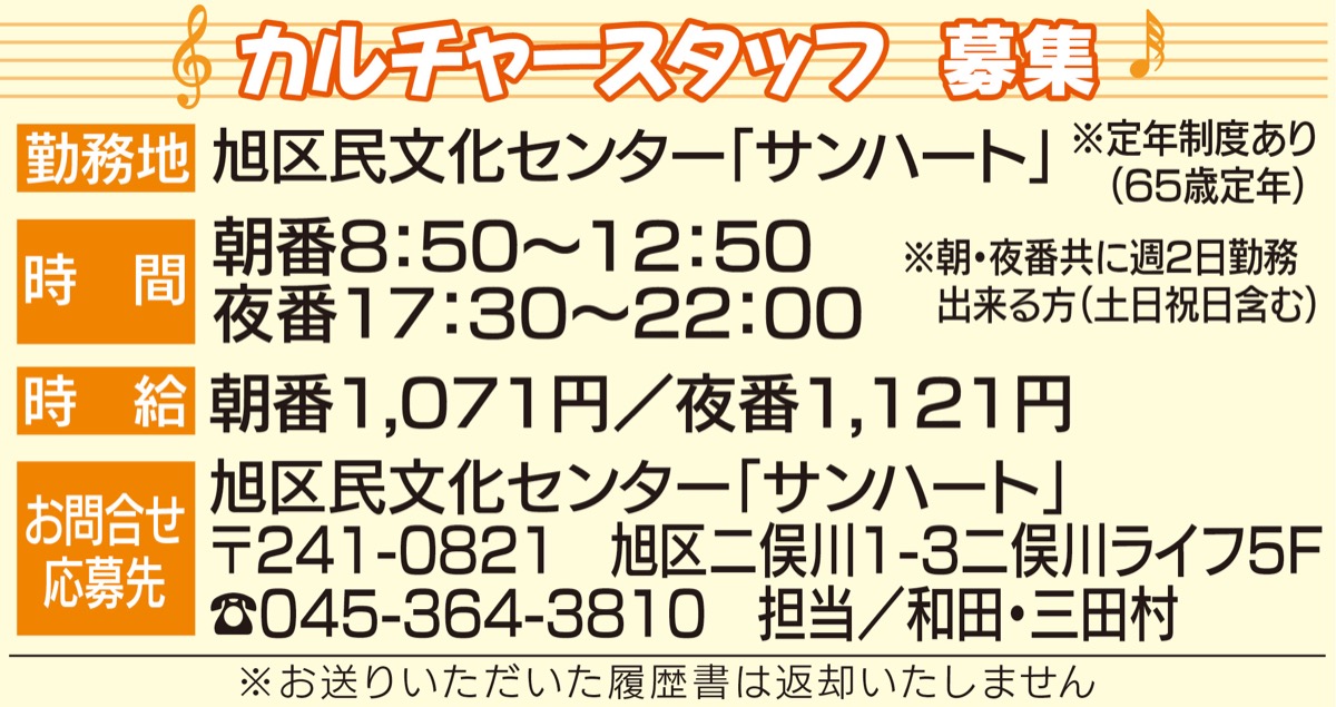 旭区民文化センター「サンハート」(二俣川ライフ5階)は、窓口業務などを担うカルチャースタッフを募集中。