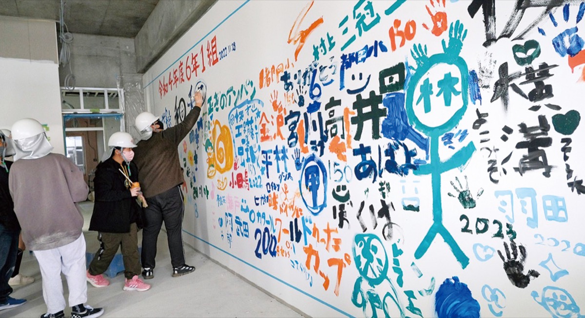 今年11月には4〜6年生の児童を対象に見学ツアーが行われた他、3月に卒業し、新校舎で授業を受けることがない6年生向けに施工体験会も行われた。