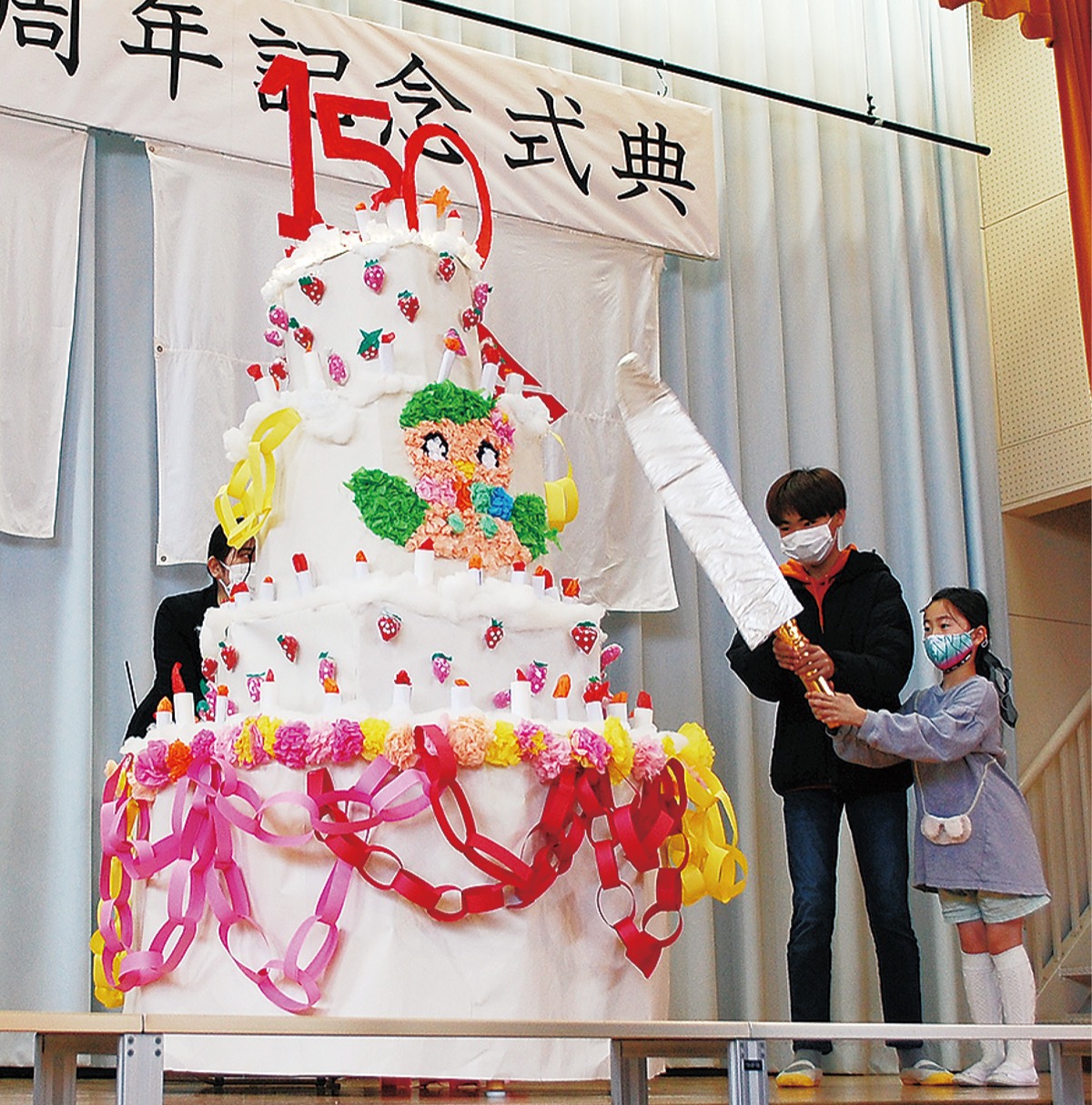 創立150周年を記念し、25日に行われた式典には、関係者と児童ら約480人が出席。児童らはケーキ入刀=写真下=や学年ごとの発表を行うなど、150年の節目を盛り上げた。あいさつに立った、創立150周年記念事業実行委員会の遠山忠司実行委員長は「今日2月25日は、都岡小の150歳の節目。まさに、この日に記念行事を行うことができました」と思いを語った。また、藤本校長は「都岡小が開校したのは、新橋―横浜間の鉄道が開業した、近代国家の夜明けのころ。戦争や高度経済成長、バブルなどを経て、現在は392人の児童が学んでいます。これからも地域に愛され、地域の伝統を育んでいきたい」と話した。