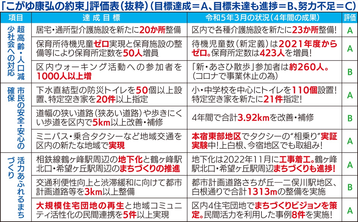 その中でも、区内の居宅介護施設などを新たに23か所整備できたことや、保育所の整備による各所の定員数を増加させたことは、私自身が定めた目標を大きく上回ることができました。これらの結果を今後の新たな政策提言につなげていきます。また、B評価となった項目についても今後の旭区に必要な施策ですので、引き続き実現に向けて、鋭意取組んでまいります。