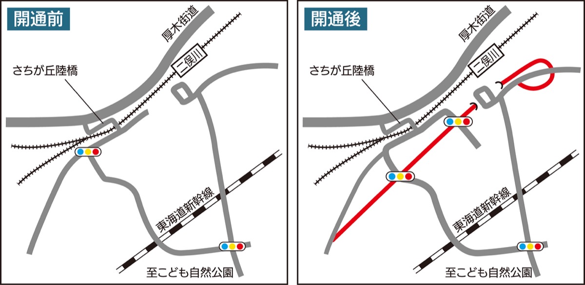 28日には関係者らが出席し、開通記念式典が行われたほか、地域住民らによる歩き初めなども行われた。開通前、さちが丘方面から二俣川駅へのルートは住宅街に大きく迂回する必要があったが、新たに二俣川駅南口ロータリー付近の下に造られたトンネルを抜ける直線ルートでアクセスできるようになった。生活道に入り込んでいた車が新道に転換することで、交通渋滞の緩和や生活道の歩行者の安全確保などに寄与することが期待されている。