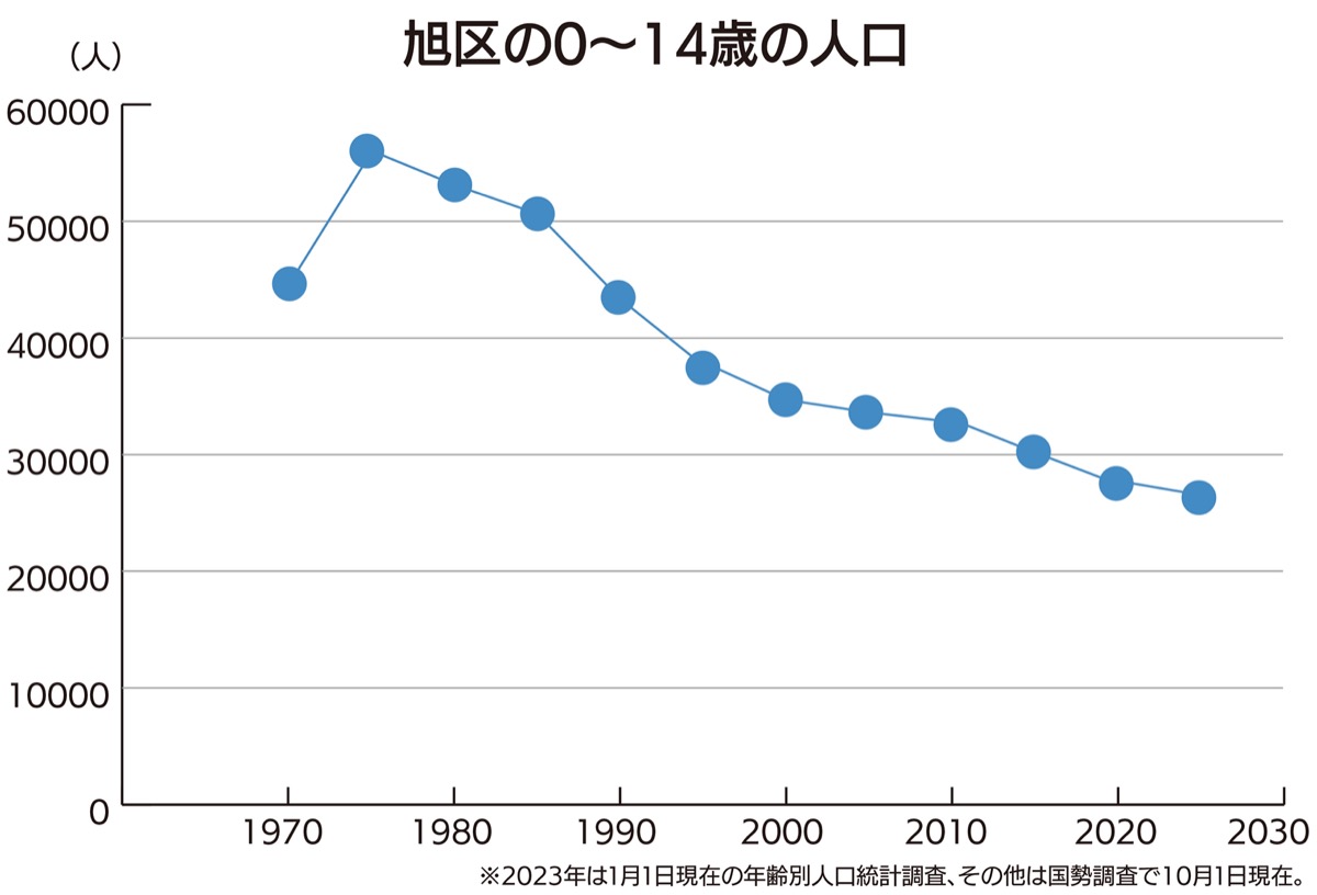 旭区の子どもの人口は、旭区が誕生した翌年の国勢調査で4万4724人。いわゆる「第二次ベビーブーム」直後の75年の国勢調査では5万7271人で、区全体の人口の28・6%を占めていた。