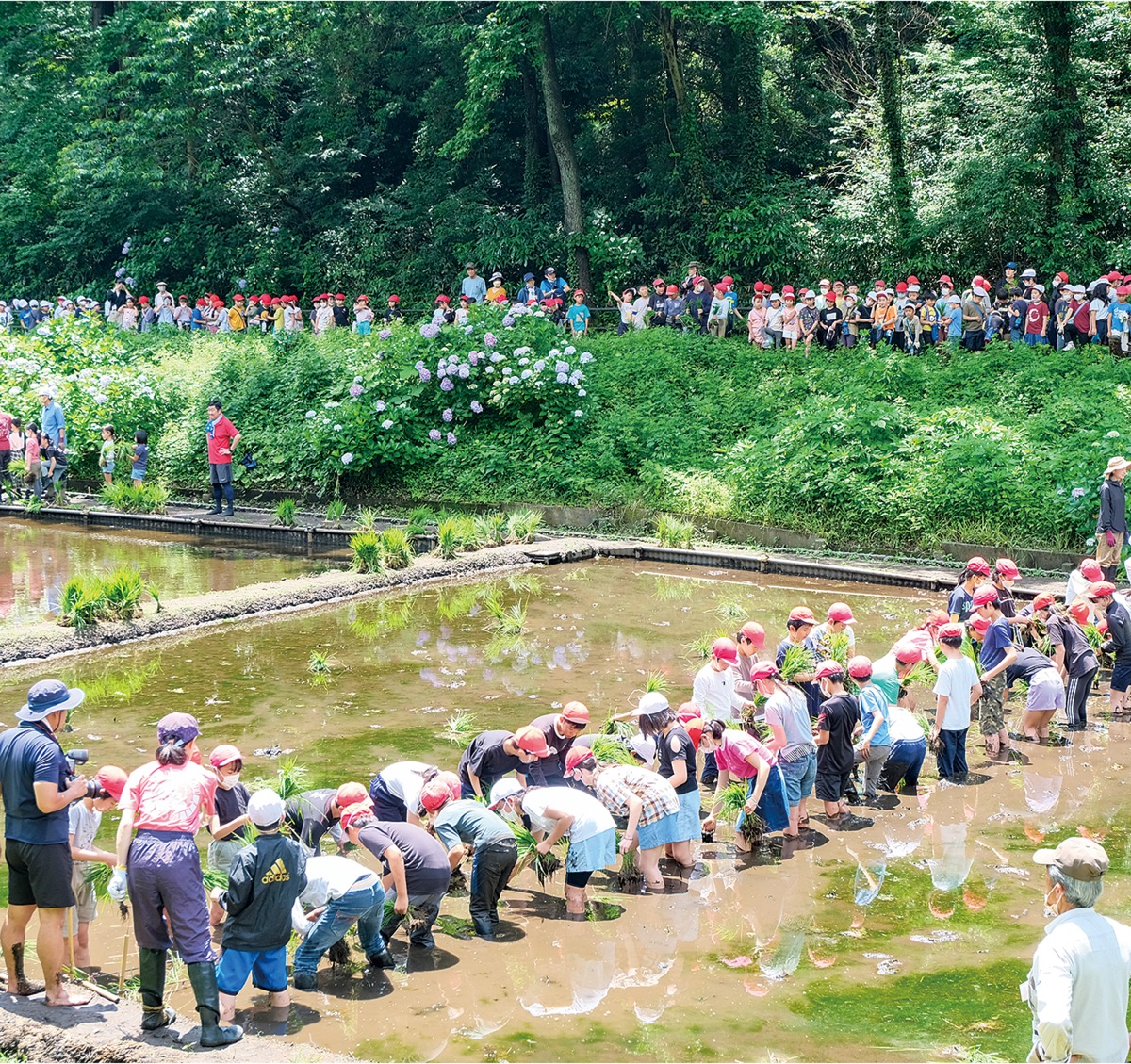 万騎が原小学校(三橋弘康校長)と南本宿小学校(鈴木亘世校長)の児童が6月13日、こども自然公園=大池町=の教育水田で田植え体験を行った=写真。