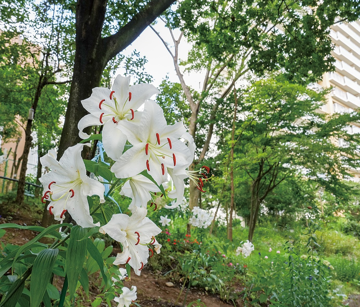 若葉台団地内のつくし公園で、ユリの一種であるカサブランカが7月中旬に見頃を迎え、公園をにぎやかに彩った。