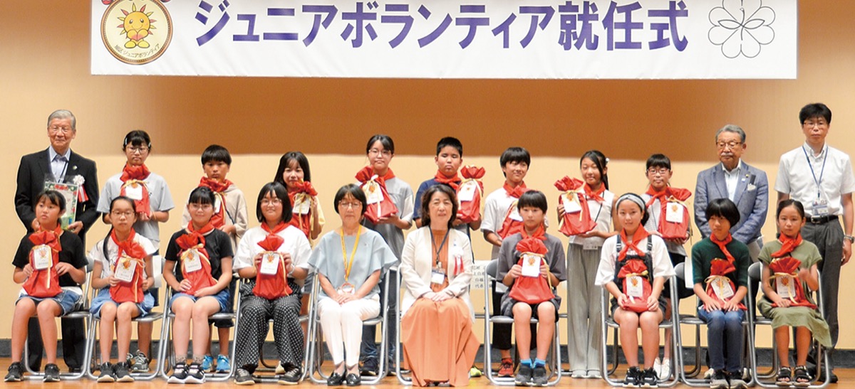 区内の小学5、6年生を対象に地域活動に取り組む「ジュニアボランティア体験事業」の就任式が8月1日、旭公会堂で開かれた。