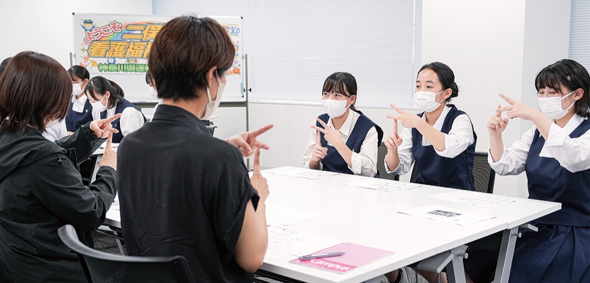 中尾の運転免許センターで9月21日と22日、二俣川看護福祉高校の手話部の生徒らが講師となり、同センター職員に向け手話講習を行った。手話講習は同センターが依頼したもの。手話の習得で、来庁する聴覚障がい者に、より一層寄り添った対応ができるようにするのが狙い。