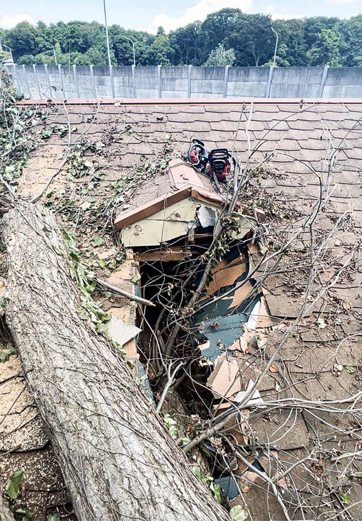 被害が発生したのは8月16日の未明。台風7号を原因とする局地的な大雨の影響で、約20mの大木が倒れた。倒木により被災したのは、同協会や他団体が育成した補助犬の認定審査会を行う「認定免許センター」と呼ばれる施設で、補助犬を引退した老犬を飼育する「老犬ホーム」としても使われていた。大木は屋根の梁を折り、天井には5カ所もの大きな穴が開き、大きな枝が室内に入り込み、施設の機能は完全にストップした。被災を受け、協会は警察と消防に連絡。現場検証とブルーシートを被せ、応急処置を施したが、倒木の撤去までに4日間を要し、その間の降雨量も多かったことから室内は水浸しになってしまった。