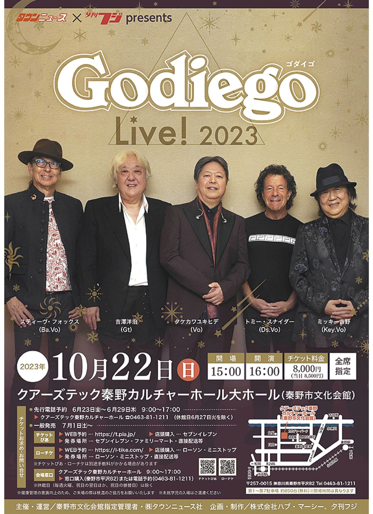 今秋から本格的に活動を再開する不朽のロックバンド、Godiego(ゴダイゴ)のスペシャルライブ「Godiego Live! 2023」が10月22日(日)、クアーズテック秦野カルチャーホール(秦野市平沢82 最寄り駅は小田急線秦野駅・渋沢駅)で開催される。