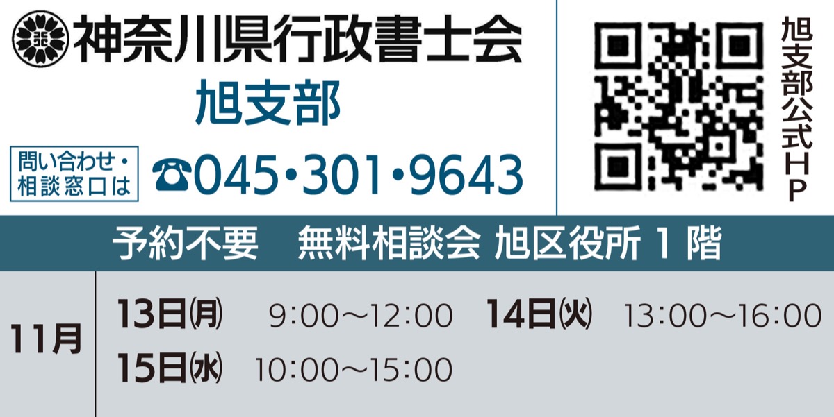 法律相談は敷居が高いよ。こんな相談聞いてくれるの?これはどこに聞けばよいのかな?そんな方に向けて、13・14・15日に旭区役所で無料相談会を開催します。15日は拡大して午前午後を通して所属する行政書士が多数参加予定です。今年のうちにお困りごと、解消しましょう。