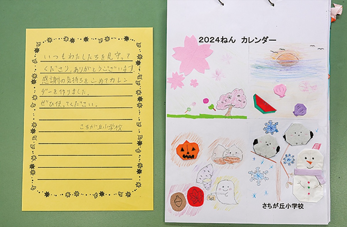 感謝集会では、普段、児童の見守り活動を行っている地域自治会の老人会である「亀生会」などが招かれ、児童たちが手作りした2024年のカレンダーが贈呈された。